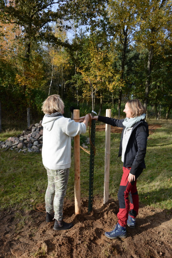 Für die Anlage dieser Obstwiese sind alte Kirsch- Apfel- und Pflaumensorten verwendet worden. Sie haben z.B. Namen wie Schopschnut, Krumpeter, Graf Althanns Reneklode oder Schneiders Späte Knorpelkirsche. Auf dieser Fläche wurden zudem Stein- und Totholzhaufen als Versteckmöglichkeiten für Insekten, Amphibien und Reptilien angelegt. An die vorhandenen großen Bäume sind Nistkästen für Stare, Sperlinge und Meisen angebracht worden. Der Standort ist sehr mager und bietet damit gute Voraussetzungen für die Entwicklung einer artenreichen und bunten Wiese. In einem ersten Arbeitsschritt ist auf einem kleinen Teilbereich der Oberboden abgeschoben worden. Relativ schnell haben sich dort charakteristische Arten des Magergrünlandes wie das Bergsandglöckchen und die Rundblättrige Glockenblume angesiedelt. Weitere Maßnahmen zur Erhöhung der Artenvielflat wie z.B. die Anlage weiterer Totholzhaufen sowie die Aussaat von gebietsheimischer Regiosaat auf Teilbereichen werden folgen. Schon jetzt werden die Wiese extensiv gemäht und das Mahdgut abgefahren sowie die jungen Triebe von Pappeln entfernt, so dass die dort wachsenden heimischen Wildpflanzen erhalten bleiben.